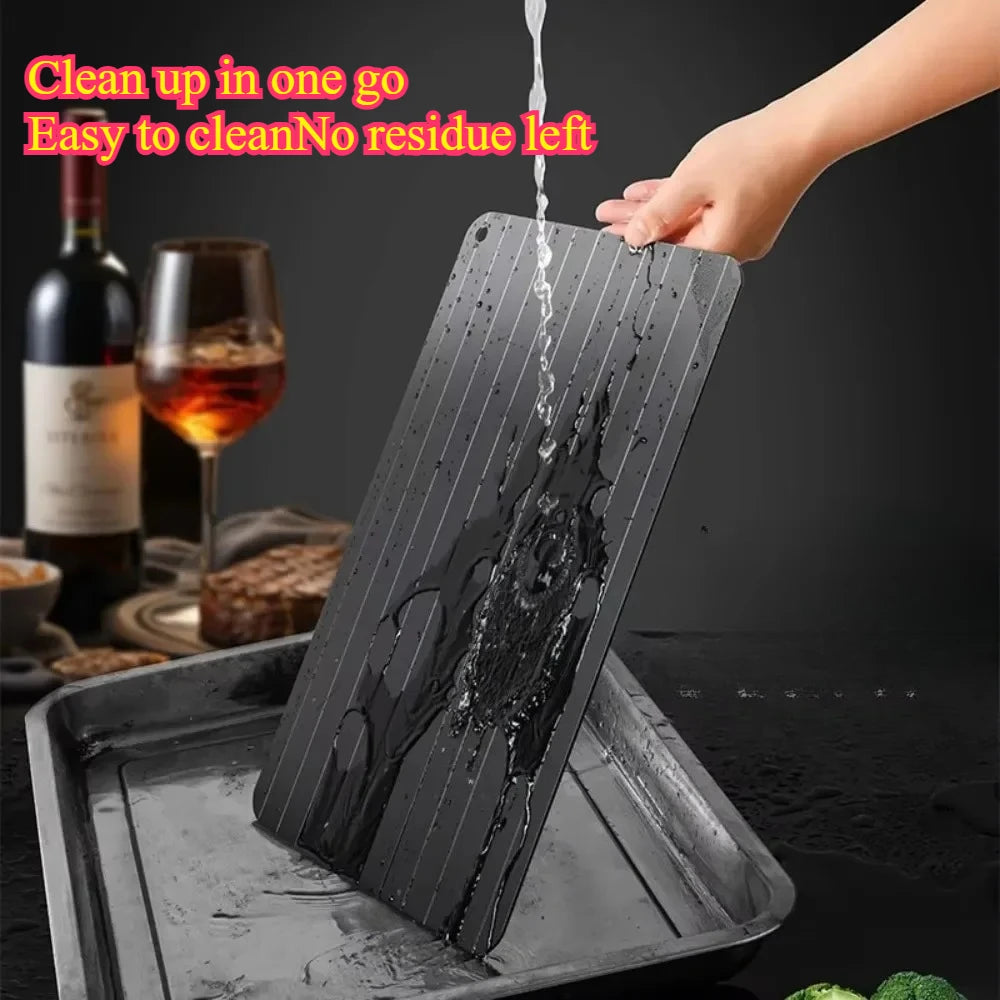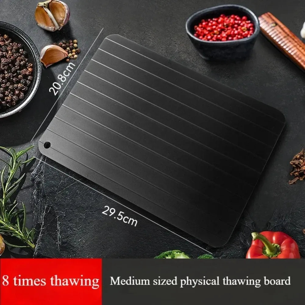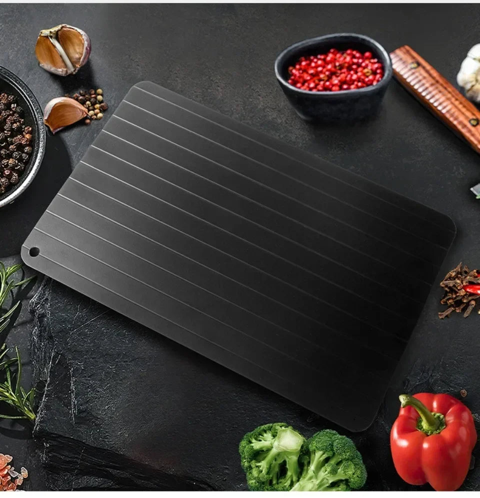 The Quick Defrosting Plate Board is designed to rapidly thaw frozen food without the need for electricity or water. Crafted from a high-quality thermal conductive material, it accelerates the defrosting process for meat, fruit, and other frozen items, preserving texture and flavor. This durable kitchen gadget offers a safe, efficient, and eco-friendly alternative to traditional thawing methods, making meal preparation faster and more convenient. Ideal for any kitchen, it ensures food is ready to cook in minutes while maintaining quality and safety.