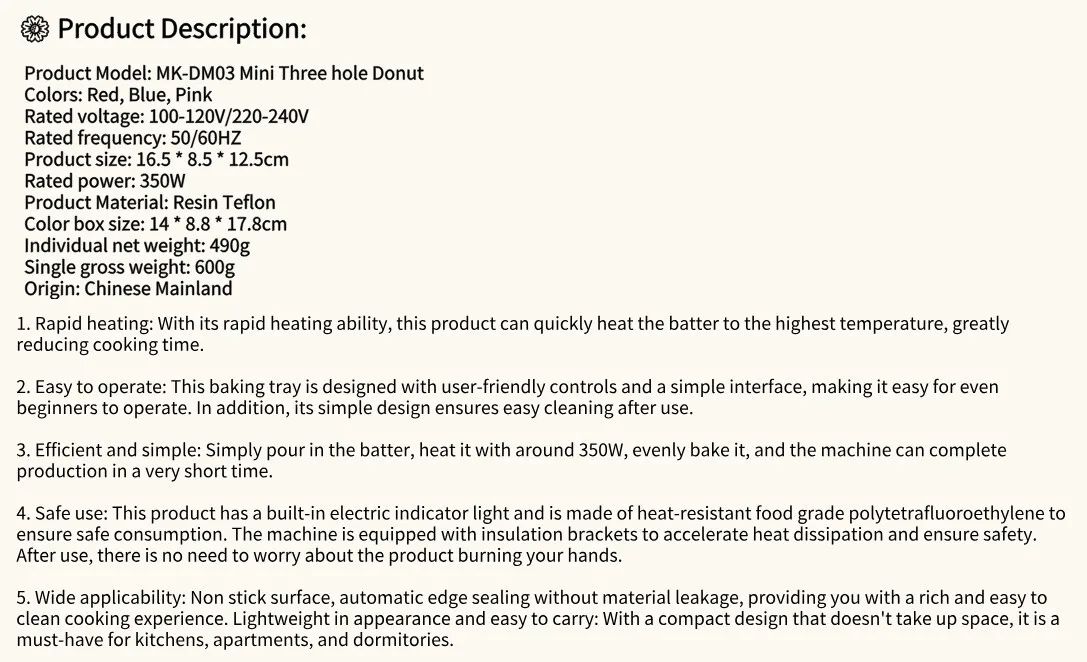3-Hole Donut Maker is a versatile food processing machine designed for efficient breakfast preparation and dessert baking. Its three-hole design allows you to create perfectly shaped donuts quickly and evenly. Ideal for home or small-scale use, this appliance ensures consistent results with minimal effort, making it a valuable addition to any kitchen focused on quality and convenience.